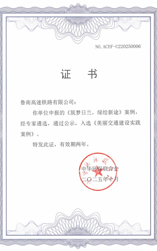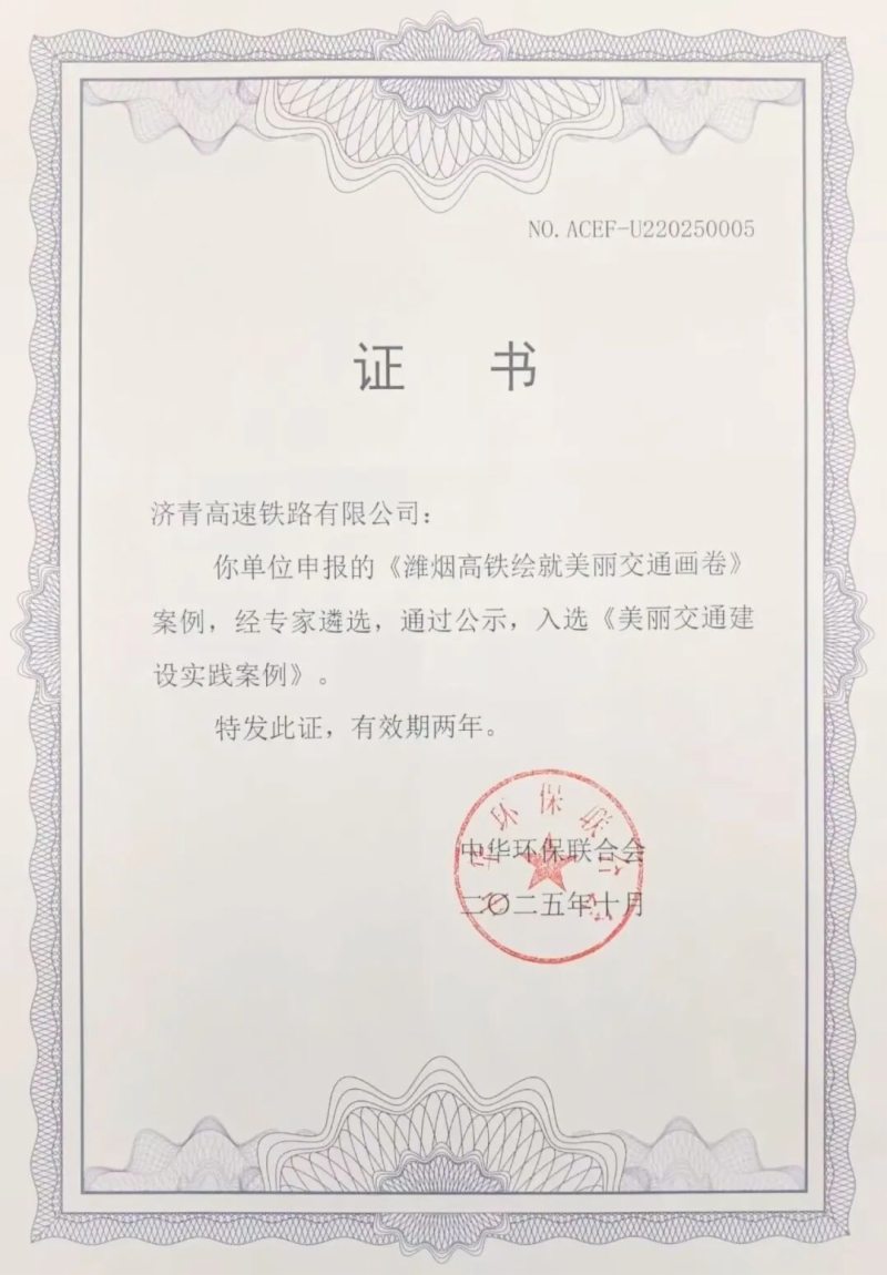 10月29日,由中华环保联合会主办的2025绿色低碳交通发展论坛在苏州举行,会上发布了“美丽交通建设实践案例”。凭借在铁路项目绿色建设、沿线生态高效保护等方面取得的卓越表现,威廉希尔集团日兰高铁、潍烟高铁2项案例成功入选并获颁证书。