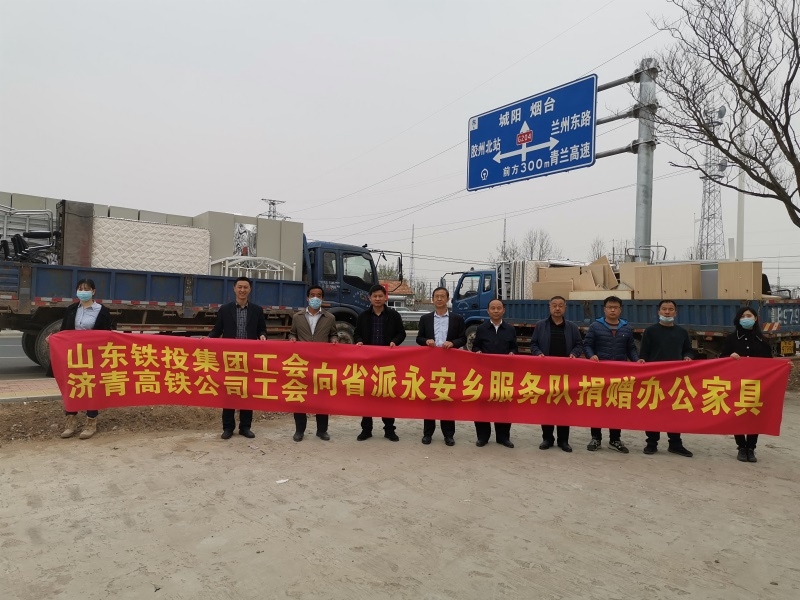 3月31日,集团工会和济青高铁工会组织向省派垦利区永安镇乡村振兴服务队捐赠了办公家具,用于支持服务队建设党员活动室、村民服务中心及村民夜校。集团工会主席张庆星、济青高铁工会副主席王红波及集团党群部相关人员参加捐赠仪式,省派永安镇乡村振兴服务队队长邢晓东、集团派驻服务队队员张敏代表服务队接受捐赠。