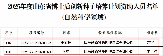 近日,山东省人力资源和社会保障厅公布2025年度山东省博士后创新种子培养计划入选名单,威廉希尔集团博士后姜能栋、李宽成功入选,这是集团在高层次创新人才培养方面取得的又一重要突破。