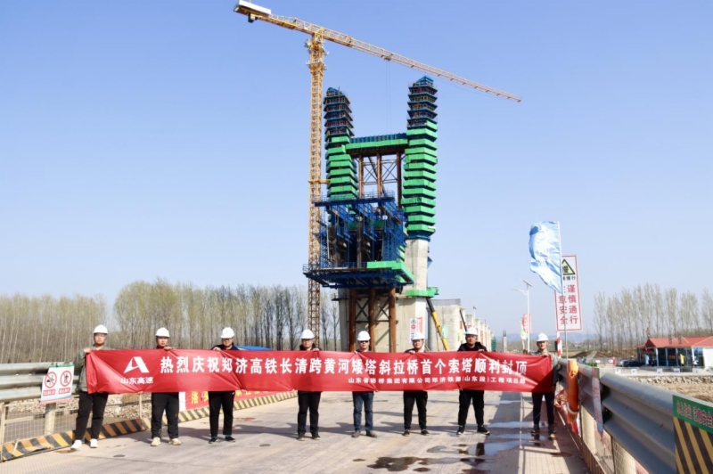 在前期施工过程中,铁投集团主要领导多次组织济郑公司及济南局集团郑济工程建设指挥部指导山东路桥项目部结合跨黄河矮塔斜拉桥建设特点,超前谋划、科学组织、合理调配资源、分解目标计划、细化工期安排,克服了异形桥塔索鞍定位、大体积混凝土、冬期极寒天气、黄河大流量下泄排洪等不利因素,顺利完成首个主墩索塔封顶。首个主墩索塔的顺利封顶,标志着大桥即将进入斜拉索挂索施工,为后期的全桥合龙以及2023年底全线开通奠定了良好的基础。