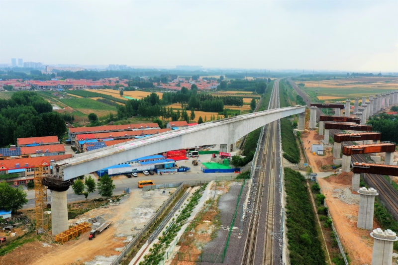 这座转体桥东接建设中莱荣高铁,西接潍莱高铁,使两条高铁实现空中对接.届时,济郑高铁、济青高铁、潍莱高铁、莱荣高铁四条高铁将形成一条横贯山东的时速350公里的快速旅客通道。