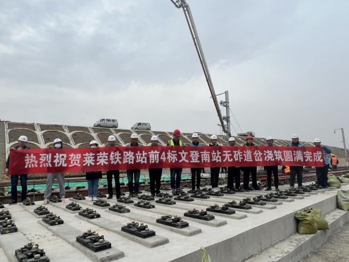 4月13日,莱荣铁路文登南站最后一组无砟道岔顺利浇筑完成,标志着莱荣高铁公司投资建设的莱荣铁路全线42组无砟道岔全部施工完成,莱荣铁路距离开通目标更近了一步。