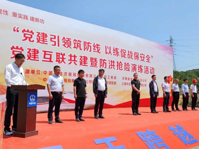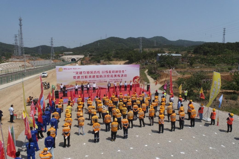 为贯彻落实主题教育“学思想、强党性、重实践、建新功”的总要求,深入坚持党建引领,切实提升防汛应急抢险能力,传承发扬2022年台风“梅花”过境时形成的抢险经验,有效应对汛期突发灾害,保障在建潍烟高铁和邻近运营铁路线安全,5月23日,济青高铁公司联合济南局集团青岛工务段、站前6标中铁上海局、监理7标上海天佑在潍烟高铁烟台上行28号路基开展2023年防汛应急演练。