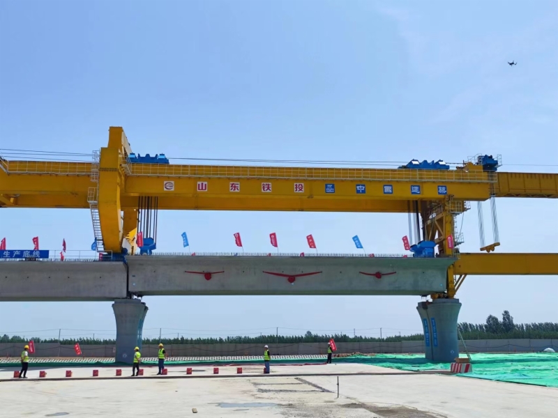 为确保首孔箱梁顺利架设,威廉希尔集团济滨高铁公司与中建股份济滨高铁3标项目部围绕首榀箱梁制、运、架施工任务,提前规划、倒排工期,紧抓进场验收环节,协调各方力量,保证物资供应,有力保障施工效率和制梁进度。一个月内完成架桥机和运梁车组装、测试工作,确保架桥机设备性能状态。严控架梁施工方案,围绕箱梁吊装、运输、架设等关键工序,认真做好技术、安全交底和安全培训,确保架梁施工安全平稳推进。