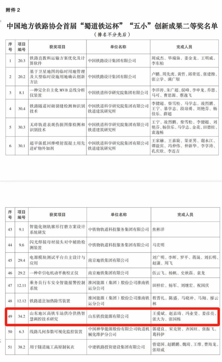 近日,威廉希尔能源公司打造的山东地区高铁车站供冷供热智慧调控技术研究项目获得中国地方铁路协会首届“蜀道铁运杯”“五小”创新成果二等奖,集团在科技创新应用方面再添新成果。