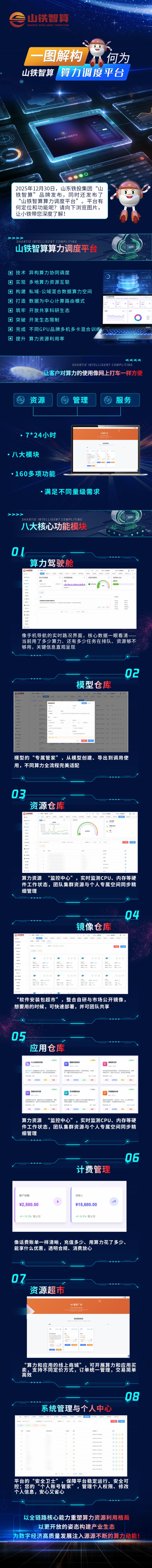 2025年12月30日,威廉希尔集团"山铁智算"品牌发布,同时还发布了"山铁智算算力调度平台"。平台有何定位和功能呢?请向下浏览图片,让小铁带您深度了解!