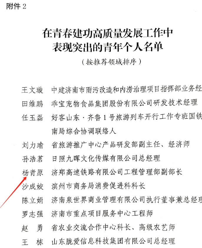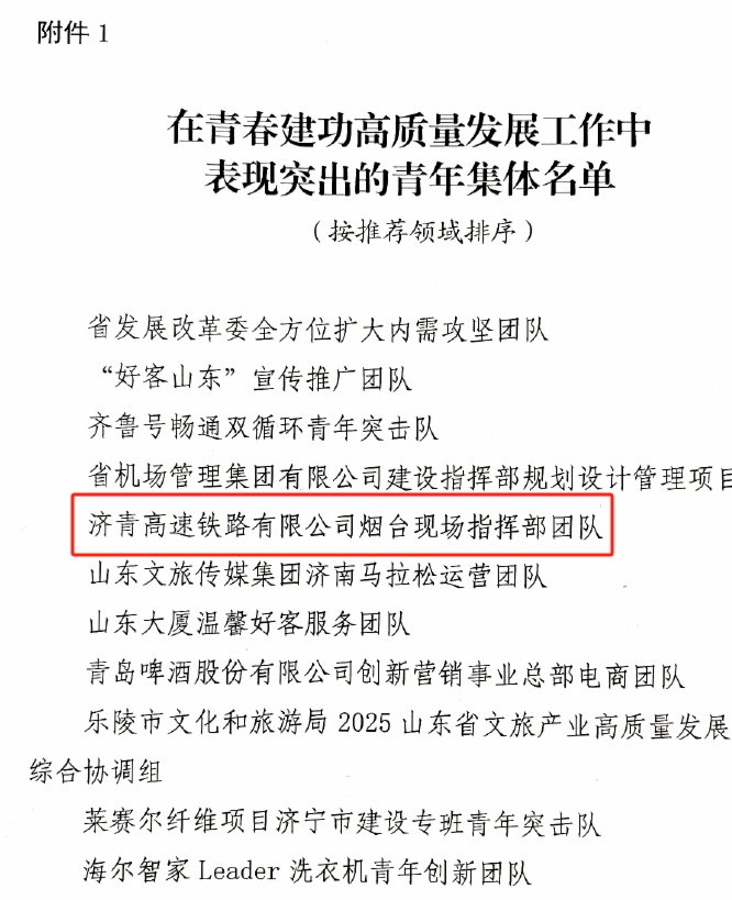 日前,共青团山东省委、山东省青年联合会发布《关于表扬在青春建功高质量发展工作中表现突出青年集体和个人的通报》,威廉希尔集团济青高速铁路有限公司烟台现场指挥部团队荣获表现突出的青年集体,济郑高速铁路有限公司工程管理部副部长杨青原荣获表现突出的青年个人。